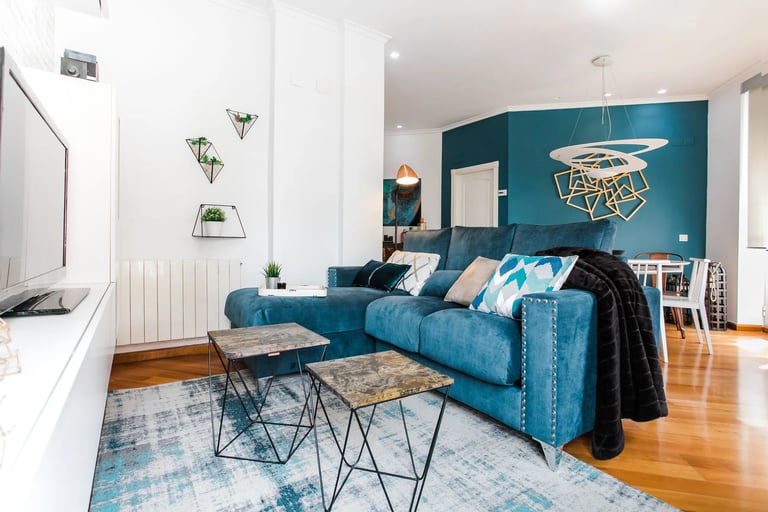 Para el salón-comedor, apostamos por tres áreas singulares que nos captan la atención y nos introducen en el estilo seleccionado. La pintura azul petróleo en las paredes que crean un volumen negativo en el comedor, el sofá del mismo color que enlaza ambas zonas y un mueble en el recibidor que transmite la fuerza del diseño en conjunto. Acompañando a esos tres elementos destacados, jugamos con los metales negros y cobres, creando un eclecticismo a todos los niveles donde la combinación de colores juegan un papel importante.