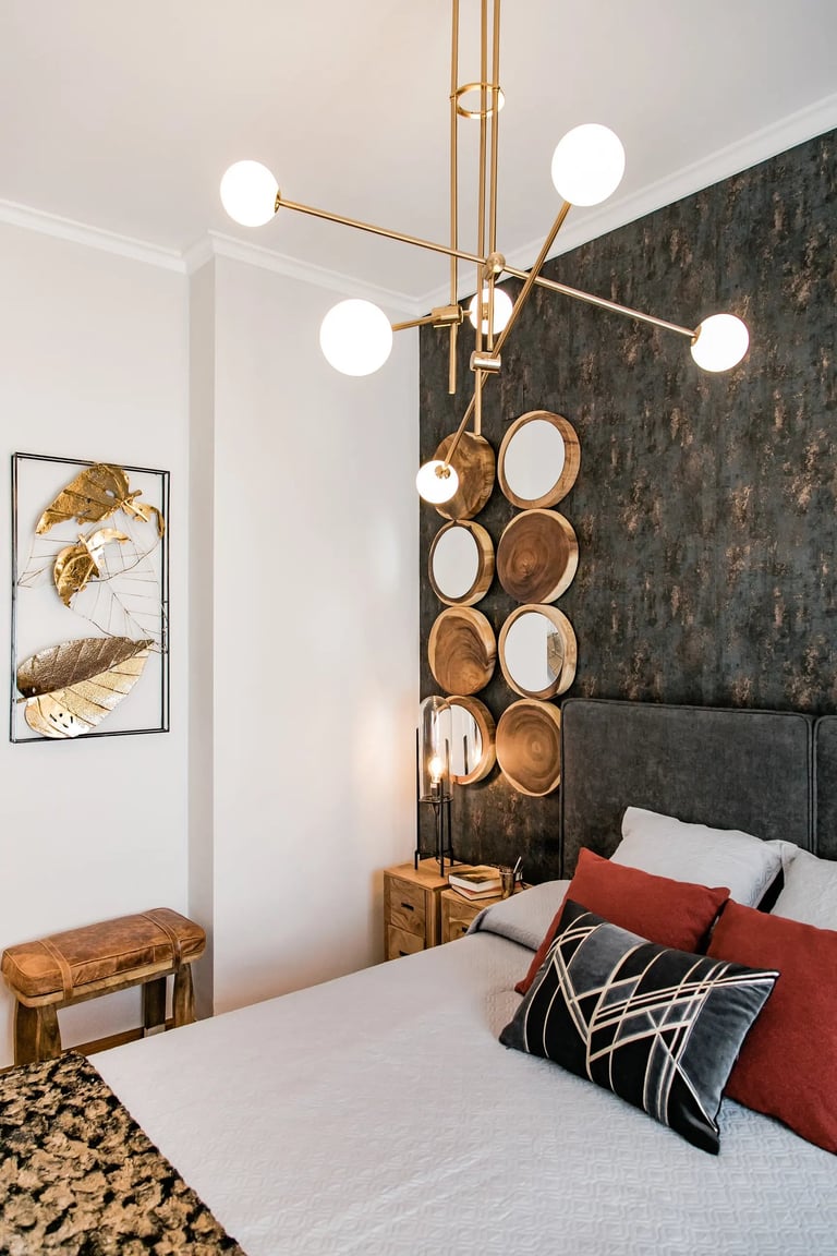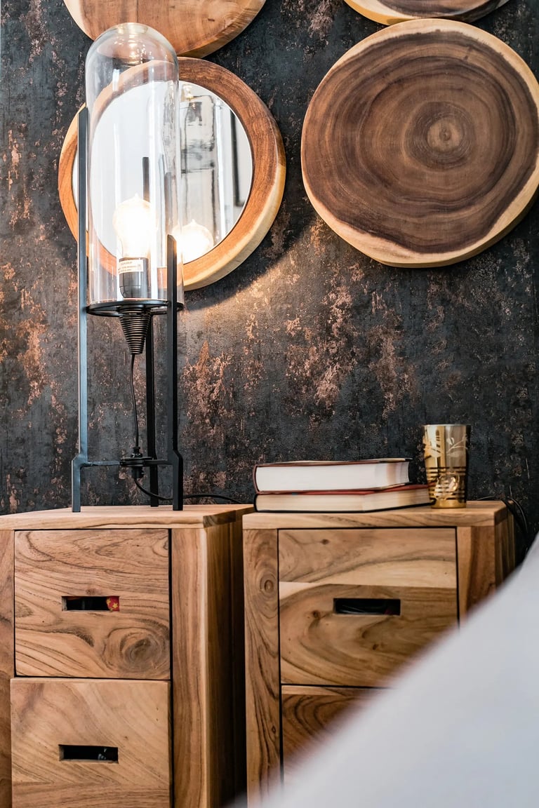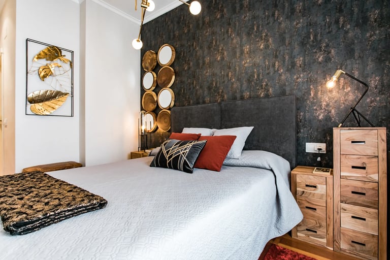 El único requerimiento que teníamos en el dormitorio principal era dotarlo de todo lo necesario para que fuera un espacio diferente, con carácter y fuerza, con un estilo mestizo propio de Raquel y Samuel, donde los materiales naturales como el cuero y la madera encajan a la perfección con los dorados, con precios asequibles. El resultado les encantó.