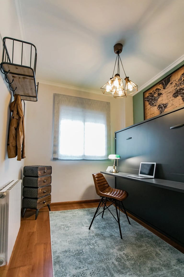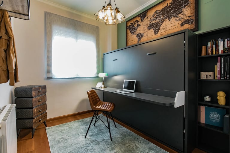 El antiguo dormitorio auxiliar para invitados, lo reconvertimos en un espacio polivalente gracias a una cama matrimonial plegable con almacenaje interior, funcionando como sala de estudio cuando la cama está cerrada, y por supuesto, acompañando en sus acabados a la estética que prevalecen en toda la vivienda.