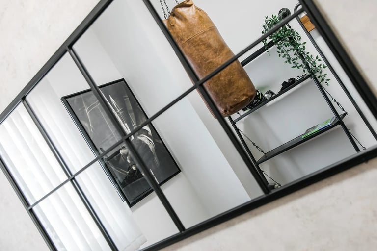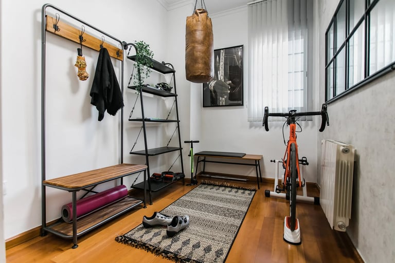 Finalmente reconvertimos el antiguo estudio/trastero/multiusos en una funcional sala deportiva para Samuel, con espacio abierto de apoyo y con una estética industrial y masculina.