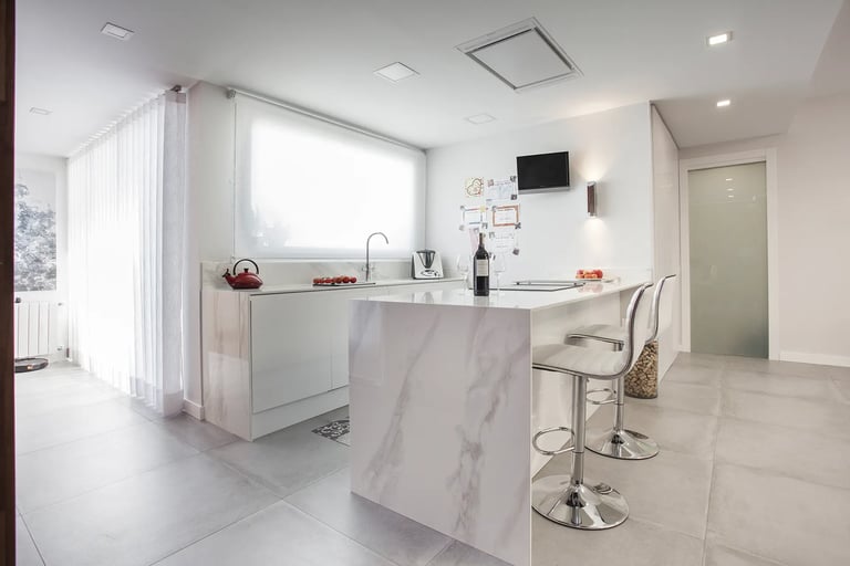 La cocina de por sí, creaba su propio volumen, por lo que la potenciamos con puertas blanco brillo, sirviendo éste concepto para extenderlo a parte del mobiliario del salón y la prolongación de armariada de cocina, que integraba una pequeña zona de estudio.